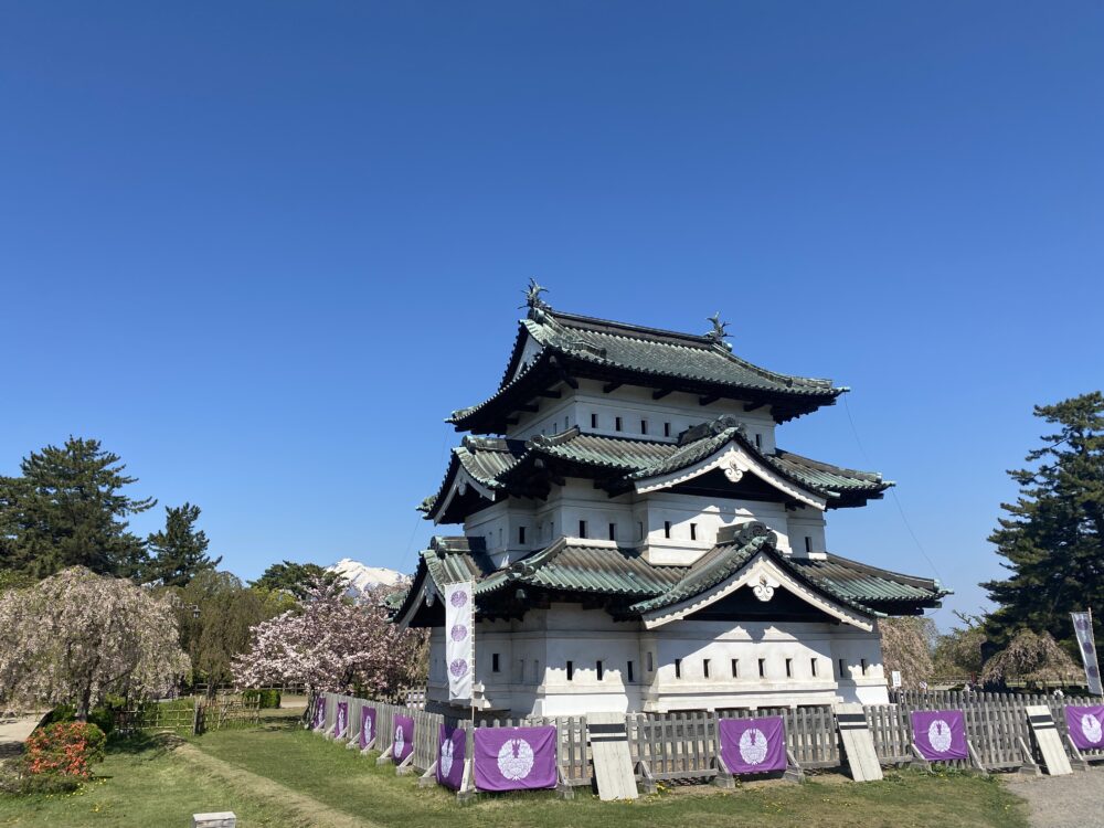城跡は国の史跡に指定されており、天守・櫓・門などが重要文化財に登録。広大な弘前公園の中心に位置し、春には約2,600本の桜が咲き誇る「弘前さくらまつり」が全国的に有名です。
