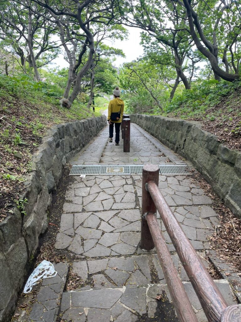 津軽海峡からの風を受け斜面を登るこの階段は、景色がよく旅情をそそる小路。健脚の方は歩いてみるのも一興です。