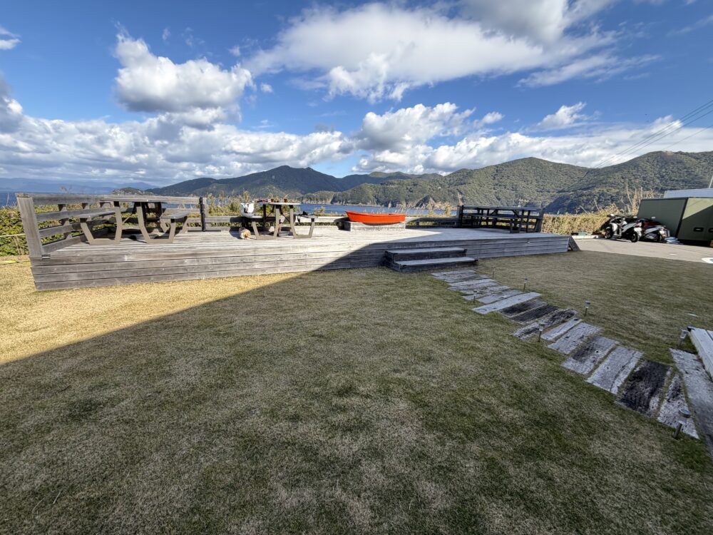 店前に芝生、テラスがあり絶景を見ながら食事ができます。